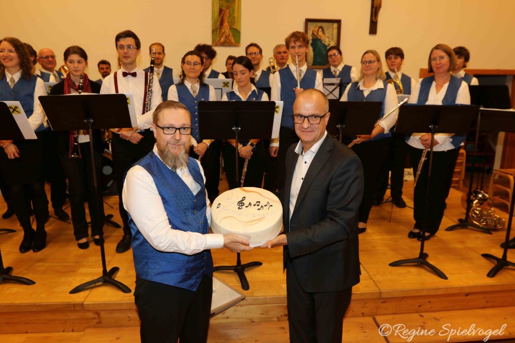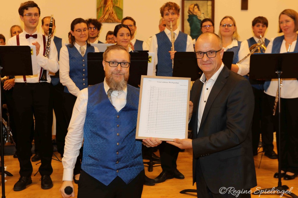 Last but definitely not least wurde im – mittlerweile auch schon zur Tradition gewordenen – Gesamtspiel der eigens von unserem Trompeter Markus Embacher komponierte Marsch „Unser schönes Wolfsgraben“ uraufgeführt, und die Partitur feierlich dem Bürgermeister von Wolfsgraben, Christian Lautner, überreicht.